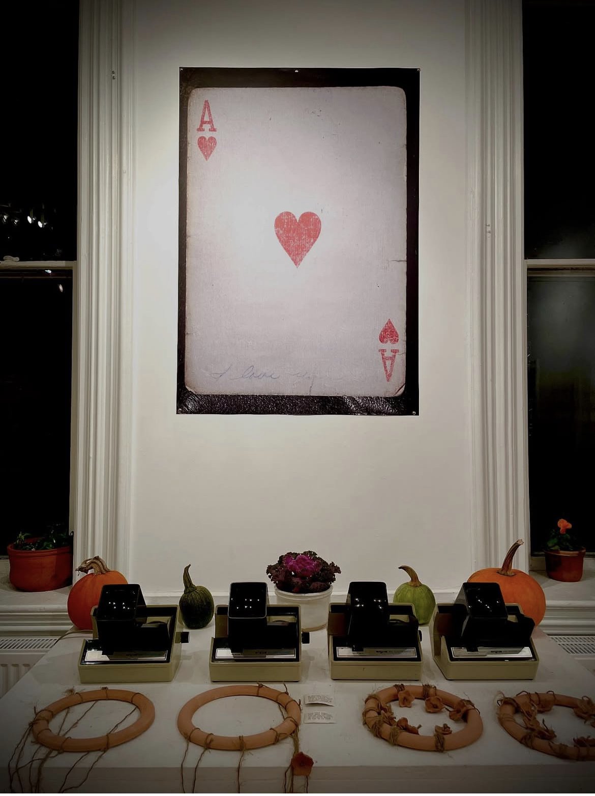Second iteration of 49 during the Easthampton City Arts Invitational at Old Town Hall in Easthampton, MA. 49 is a destructive ceramic musical exploration offered over 21 performances and installation during the year (2025-26) that I turn the age my father was when he died. 49 allows me to come face-to-face with my own physical body in this year through dance, performance and physical harvesting and creation with clay. This aspect of the second iteration features a wall-sized print of an Ace of Hearts card upon which my mother wrote "I love you," and which my father carried in his wallet while serving in the Air Force during the Vietnam War. Below the print are four slide viewers and terracotta soundmakers with 32 terracotta cherry blossoms. This pays respect to my parents meeting under a cherry tree and dancing to Wild Thing. They were together 32 years after that night.