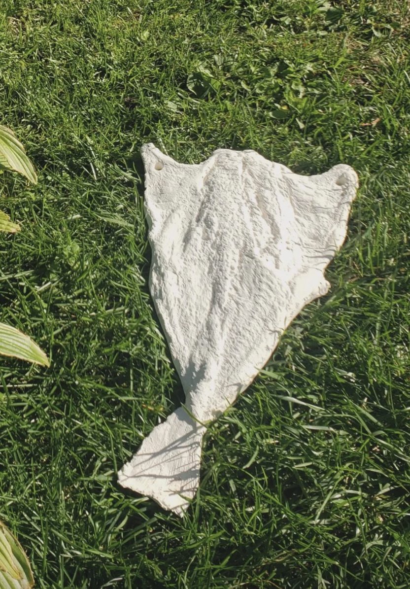 A ceramic bacalhau (salted codfish) that was used as a musical instrument during the third iteration of 49 in the Trustees of Reservations' Haskell Public Gardens in my hometown of New Bedford. 49 is a destructive ceramic musical exploration offered over 21 performances and installation during the year (2025-26) that I turn the age my father was when he died. 49 allows me to come face-to-face with my own physical body in this year through dance, performance and physical harvesting and creation with clay.