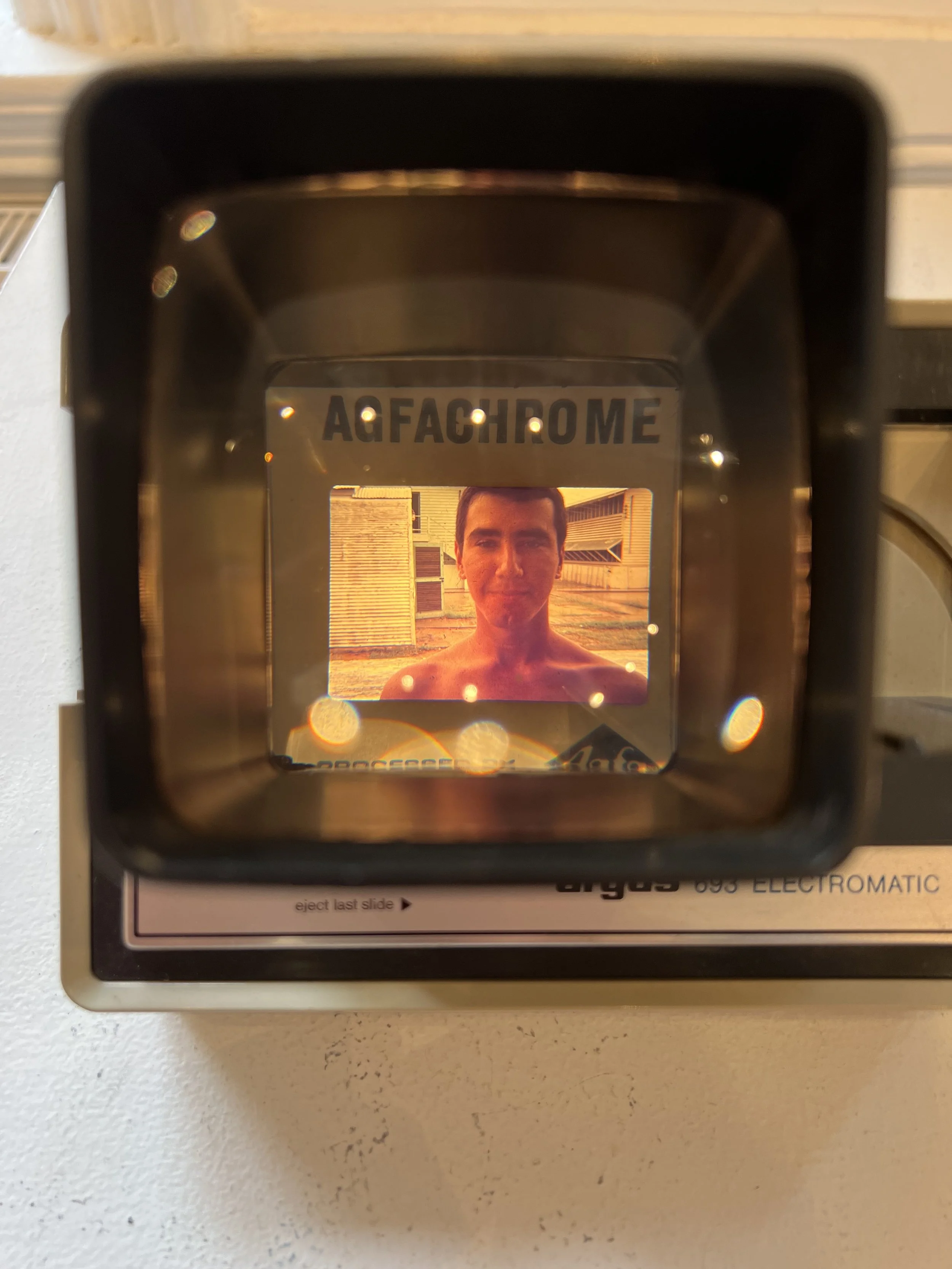 My father in archival slide displayed at second iteration of 49 during the Easthampton City Arts Invitational at Old Town Hall in Easthampton, MA. 49 is a destructive ceramic musical exploration offered over 21 performances and installation during the year (2025-26) that I turn the age my father was when he died. 49 allows me to come face-to-face with my own physical body in this year through dance, performance and physical harvesting and creation with clay.